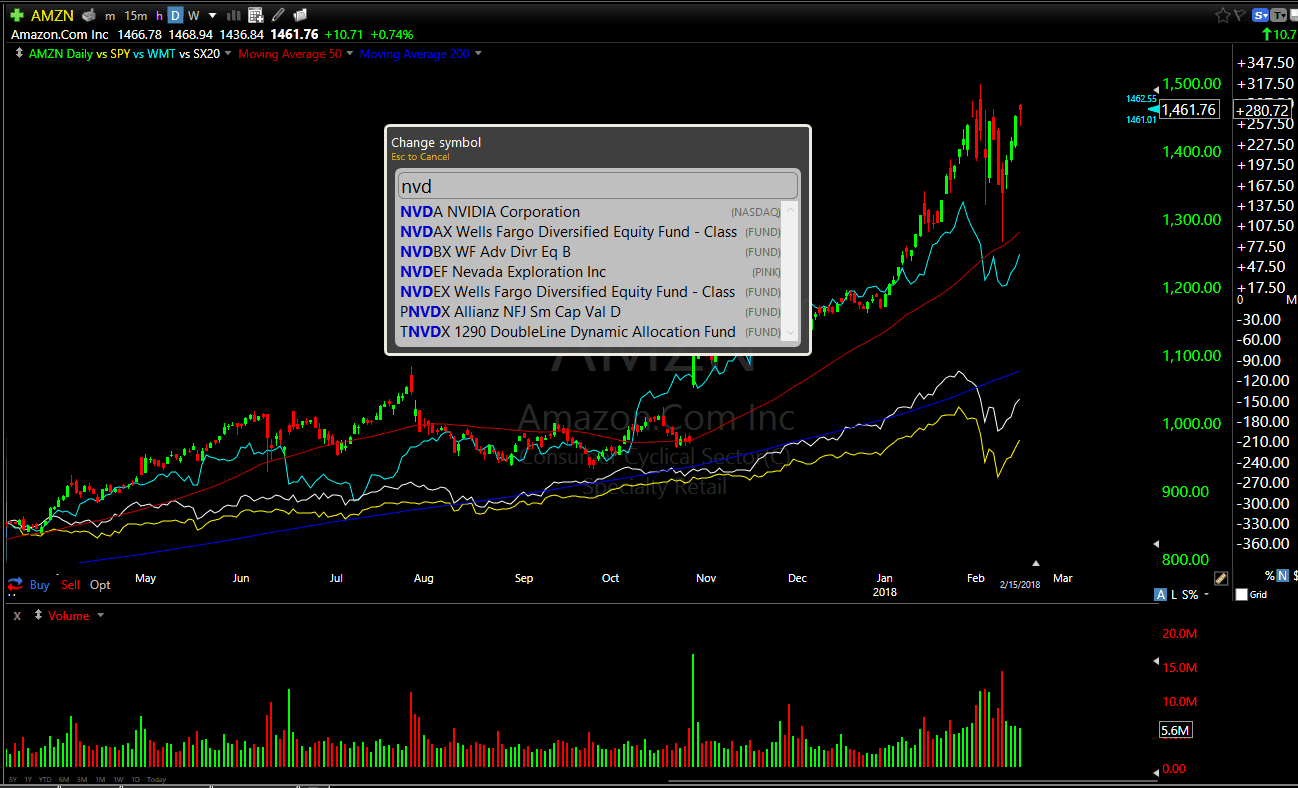 Another subtle feature that, in my opinion, drastically improves the UX is the Change Symbol screen automatically opening when you begin typing, similar to TradingView. So when you have a chart of AMZN open, and you type any letters on your keyboard, the Change Symbol window will open. This small improvement in UX really builds up over time. Having to mouse over to the symbol box every time you want to change symbols is one of the most annoying things about charting platforms.