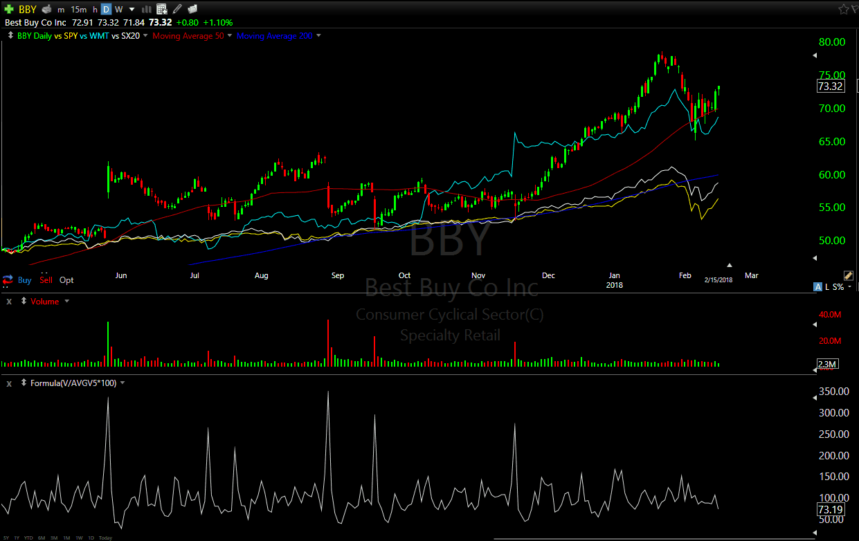 Another rarity in charting platforms, as found in our TC2000 review, this platform allows you to add formulas like (Volume/5 bar average volume * 100) and use them as indicators, or more commonly, use them to set alerts. The indicator used in the image below looks at the average volume over the last five price bars, it would be simple to set an alert above 250 (any value you find significant enough to trade).