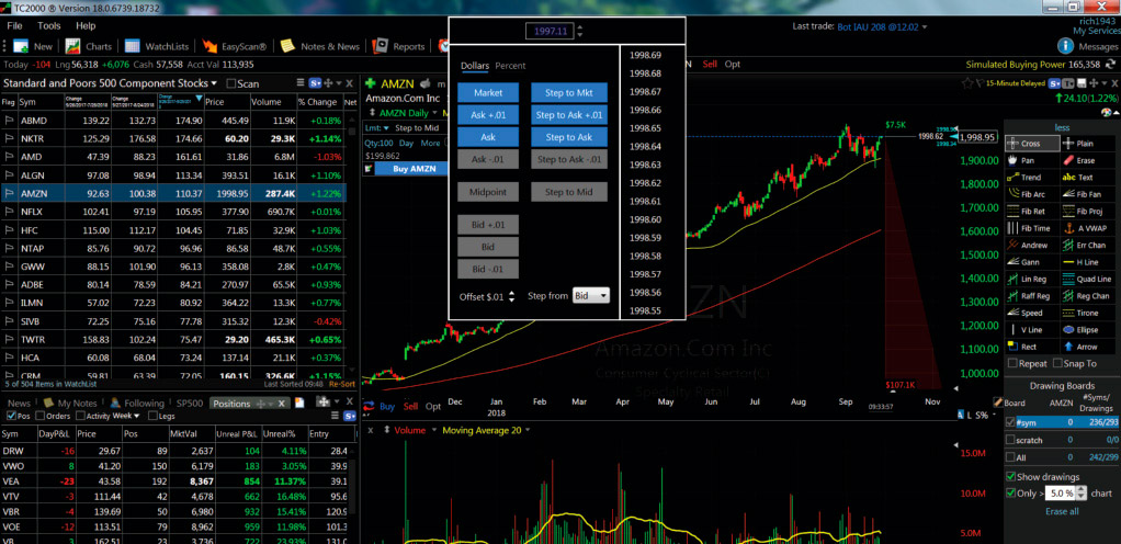 DrillDown was introduced in Version 17 and is a prebuilt layout designed to provide a simple top-down method of market analysis. Trade management directly from the chart is not really new, but the new "step to market" orders are designed to get better fills by placing several limit orders before placing your market order (Figure 3). Step to market orders can be used with stocks, options, conditional orders, and multileg strategies. The option strategies feature, introduced in Version 17, will appear directly on the chart by clicking on the opt button on the lower left of the chart. The strategy ticket is divided into bullish, bearish, and volatility categories. Once a strategy is chosen, the profit & loss zones are highlighted on the chart and can be easily changed by dragging the strike price up or down or by clicking the left and right buttons to change the expiration dates.